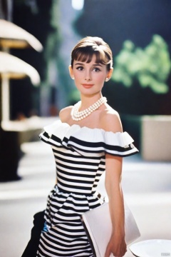 (masterpiece, best quality, hyper realistic, raw photo, ultra detailed, extremely detailed, intricately detailed), (photorealistic:1.4), (photography of Audrey Hepburn wearing a fashionable Striped off-the-shoulder ruffle hem dress, designed by Hubert de Givenchy, ), (smile), fairy, pure, innocent, beauty, (slender), super model, adr, Breakfast at Tiffany's, Sabrina, (glide_fashion), depth of field, (full shot), film grain, zeisslens,symmetrical,8kresolution,octanerender(OC渲染), extremely high-resolutiondetails,finetexture,dynamicangle,fashion(时尚), fashion,,