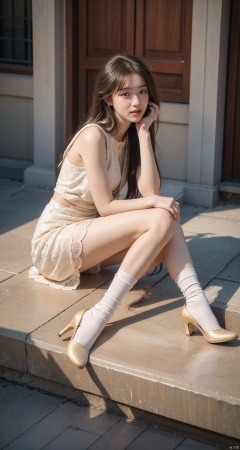 1girl, moyou, bangs, very long floating hair, full_body, looking at viewer,heigirl, from below, full body, Fisheyelens, high heels, Low shutter,lace up socks, xxmixgirl, dunhuang, 21yo girl, 1girl, beautiful face, feet, leg, real hands