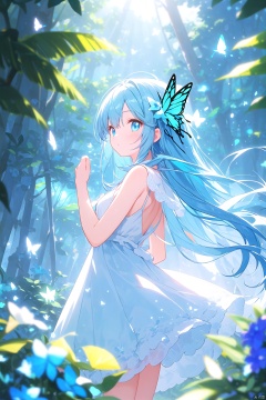 wide shot,(depth of field),global illumination,soft shadows,grand scene,backlight,lens flare,((colorful refraction)),((cinematic lighting)),forest,from side,looking outside,with butterfly,1girl with lightblue long hair and blue aqua eyes,hair flowers,hime cut,sunlight,blurry background,blurry,white dress,