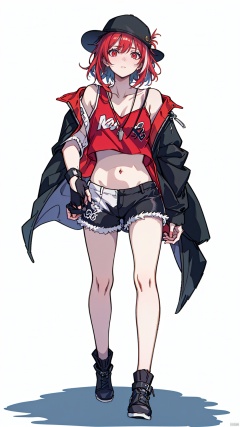 (masterpiece:1.3),(the best quality:1.2),(super fine illustrations:1.2),(Masterpiece),high quality,high detail,((white background:1.2)),looking at viewer,(SOLO:1.4),outline,simple background,fullbody,, red eyes,long hair,hair between eyes,very long hair,multicolored hair,black jacket,collarbone,thighs,open jacket,boots,black shorts,black footwear,sleeveless shirt,shorts,shirt,off shoulder,black headwear,navel,jacket,hat,grin,eyebrows visible through hair,bangs,:d,