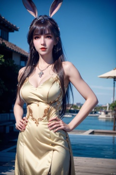 1girl, solo, realistic, jewelry, necklace, brown hair, dress, breasts, brown eyes, hands on hips, cleavage, earrings, lips, white dress, simple background, looking at viewer, medium breasts, short hair,makeup,fashion model,picture-perfect face,flowing hair,shiny skin,upper body,full body,(Shooting background board,photostudio),(simple),(masterpiece, top quality),master piece,professional artwork,famous artwork,(realistic,photorealistic:1.37) ,HDR,UHD,8K, ultra realistic 8k cg,8K, 32k,HD, (rabbit ears,((,long hair))), xw