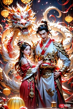 (龙年, 2024 four New Year,1girl, Dragon, Oriental Dragon, ),Loli,Reunion, firecrackers, fireworks, Spring Festival couplets, blessings, flower seas, ancient times,In the scene of Chinese New Year, every household decorates their homes with red couplets and lanterns hanging on the doors. The streets are adorned with colorful lights, filled with a festive atmosphere. People dress in their finest clothes, wearing red garments that symbolize good luck and auspiciousness.