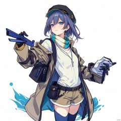 (masterpiece:1.3),(the best quality:1.2),(super fine illustrations:1.2),(Masterpiece),high quality,high detail,((white background:1.2)),looking at viewer,(SOLO:1.4),outline,simple background,fullbody,, hair between eyes,bangs,hat,long sleeves,blue eyes,solo,1girl,long hair,smile,gloves,fu hua,grey hair,(yellow sweater),green legwear,green vertical-striped legwear,vertical-striped legwear,pantyhose,belt,cross-laced footwear,brown jacket,beret,brown shorts,yellow scarf,