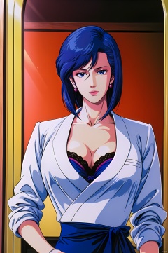 Saeko, 1girl, solo, retro artstyle, hand on hip, cleavage, earrings, breasts, jewelry, blue hair, blue eyes, 1990s \(style\), bra, upper body, looking at viewer, medium breasts, 1980s \(style\), collarbone, short hair, underwear, nice hands,  perfect balance,  (looking at viewer:1.5),  closed mouth,  (Light_Smile:0.3),  official art,  extremely detailed CG unity 8k wallpaper,  perfect lighting,  Colorful,  Bright_Front_face_Lighting,  White skin,  (masterpiece:1),  (best_quality:1),  ultra high res,  4K,  ultra-detailed,  photography,  8K,  HDR,  highres,  absurdres:1.2,  Kodak portra 400,  film grain,  blurry background,  bokeh:1.2,  lens flare,  (vibrant_color:1.2),  professional photograph,  (narrow_waist),  dark studio, dark studio, , Saeko