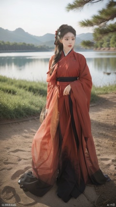 wuxia,1girl,solo,full body,tree,lake background,blue sky hanfu,embroidered flower patterns,traditional chinese clothing,Royal court,deep cleavage, slender and beautiful legs,horse,