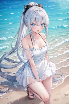 1girl, ginka, swimsuit, solo, sliver hair, ponytail, looking at viewer, butterfly hair bow, sandals, blue eyes, bangs, blush, shirt, beach, open mouth, bubble, white shirt, off shoulder, knees up, outdoors, sand, breasts, hair between eyes, halterneck, small breasts, long hair, water, short sleeves, bare shoulders, bikini under clothes, white footwear, skin fang, hairclip, jewelry,