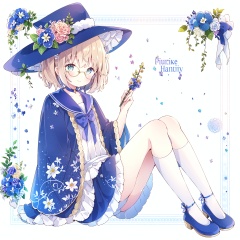 1girl,blue_bow,blue_choker,blue_flower,blue_ribbon,character_name,choker,sitting,long_sleeves,mary_janes,kneehighs,copyright_name,daisy,dress,floral_background,flower,full_body,glasses,green_eyes,hat,holding,holding_flower,hydrangea,leaf,lily_\(flower\),lily_of_the_valley,lotus,morning_glory,plant,ribbon,sailor_collar,short_hair,smile,solo,white_flower,white_headwear,<lora:20231231-1704012408435-0020:0.8>,