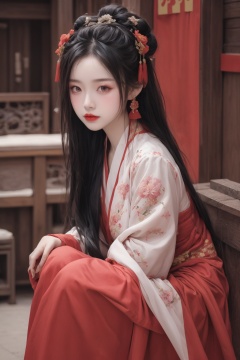 Chinese New Year,red traditional clothing,expression of happiness and joy,Chinese traditional clothing,Chinese style,traditional building background,screen,traditional ink painting style,Chinese girl,beautiful girl,long hair,1girl,solo,flower,hair ornament,black hair,dress,jewelry,long hair,hanfu,earrings,long sleeves,chinese clothes,full body,hair bun,purple dress,red lips,looking at viewer,table,red flower,