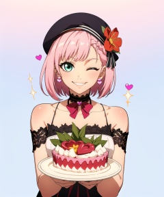 Winter Solstice,1girl,looking at the viewer,short hair,bangs,brown hair,hair accessories,hat,bow,ribbon,bare shoulders,jewelry,green eyes,upper body,pink hair,flowers,heart,headband,earrings,one eye closed,choker,hair flower,bow tie,off the shoulders,grin,head tilt,eyelashes,sparkles,beret,white headdress,(pink and blue background:1.2),pink bow,lace decoration,lace,cap flower,lace choker,hug,double braid,white background,holding cake,