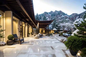 (best quality:1.2), (marble floor), maple leaves, 1 luxury hotel in (snow-capped mountain:1.3),rock moutain, potted plants, rattan chairs, bare rocks, snow,