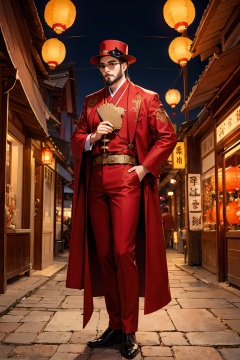 neo-chinese style,national tide,1Chinese boy,facial hair,Hanfu,solo,male focus,red background,beard,mustache,robe,chinese clothes,new year costume,new year,sunglasses,hat,standing,full body,red theme,(City street scene :1.2),(Lantern :1.2),(Lantern decoration :1.2),(Scene depth :1.3),(Blurred background:1.2),Big scene,30 degree view,New Year,New Year costume,hand fan,chair,holding,red shirt,Jacket,black shirt,round glasses,short hair,red background,crossed legs,simple background,hand fan,<lora:sdxl_National fashion:0.8>,masterpiece,best quality,