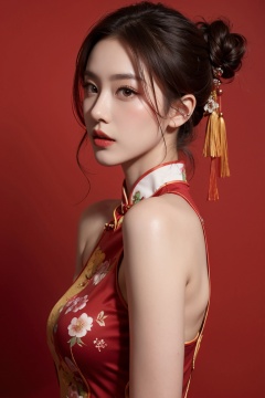 neo-chinese style,national tide,1girl,solo,chinese clothes,sunglasses,china dress,double bun,nail polish,hair bun,dress,hair ornament,red background,looking at viewer,upper body,new year costume,New Chinese cheongsam,new year,red nails,brown eyes,realistic,lips,makeup,lipstick,tattoo,red lips,simple background,red dress,adjusting eyewear,brown hair,pink nails,new year 2024,<lora:sdxl_National fashion:0.7>,masterpiece,best quality,