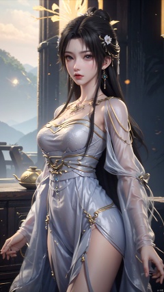 masterpiece,best quality,1girl, dress, black hair, long hair, solo, facial mark, white dress, jewelry, forehead mark, hair ornament, earrings, necklace, chinese clothes, hair bun, cowboy shot, dynamic pose, dynamic angle