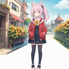(best quality),((masterpiece)),(highres),standing,(full body),(black thighhighs),original,(loli:1.2),(petite:1.2),Pink hair,Yellow eyes,(red Jacket),high ponytail,white collared shirt,hair flower,fipped hair,floating hair,Frown,hands in pockets,black dress,red bowtie,(solo),sky,skyline,skyscraper,smile,solo,sunflower,tower,upper_body,white flower,animal ears,<lora:mystyle3-000029:0.6>,