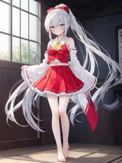 skirt, 1girl, long hair, detached sleeves, blue eyes, red skirt, red bow, barefoot, ascot, bow, hair bow, hair tubes, frills, yellow ascot, full body, white hair, ribbon-trimmed sleeves, looking at viewer, ribbon trim, wide sleeves, standing, long sleeves, solo, bangs, shirt, blush, very long hair, vest, closed mouth, bare shoulders, trembling, frilled skirt, skirt set, nontraditional miko, frilled bow, bare legs, sidelocks, red vest, alternate hairstyle, sleeveless, hair between eyes, orange ascot, midriff, white sleeves, ponytail, In the shrine