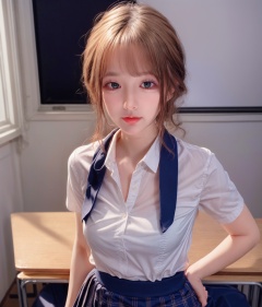 Ultra-realistic 8k CG,masterpiece,best quality,(photorealistic:1.4),HDR,absurdres,Professional,RAW photo,lens flare,(film grain:1.1),Bokeh,((Depth of field)),studio light,1girl,blue eyes,exquisite face,black_hair,long_hair,bangs,solo,best ratio four fingers and one thumb,close-up,upper body,Highly detailed,Professional,extreme detail description,looking at viewer,early morning serenity,standing,school_uniform,serafuku,microskirt,miniskirt,classroom,<lora:add_more_details:0.5>,<lora:少女日记1.0_v4-000016:0.8>,<lora:NO.6_v3-000016:0.8>,