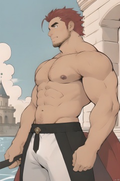 1boy,horns,topless,stubble,facial hair,mature male ,muscular,red hair,heterochromatic eyes, floating palaces, fine, beautiful eyes, Beautiful and delicate hair, delicate face, Complex court suits, complex clothing, detailed clothing decoration ,male focus, undercut,short hair,