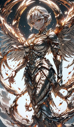 ral-lava, attentive female, highly detailed face, flaming wings, lace filigree, super resolution, symmetry, white parchment background, 3/4 shot
