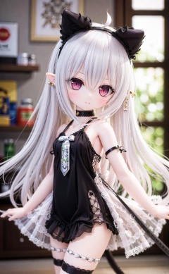 (cowboy shot,very long hair,4349:1),1girl,solo,animal_ears,cat_ears,one_eye_closed,tail,red_eyes,white_hair,black_dress,animal_ear_fluff,cat_tail,cat_girl,long_hair,dress,ahoge,bangs,depth_of_field,blurry,blush,window,very_long_hair,hair_between_eyes,blurry_background,closed_mouth,bare_shoulders,looking_at_viewer,sleeveless_dress,frills,strap_slip,sleeveless,tail_raised,bare_arms,