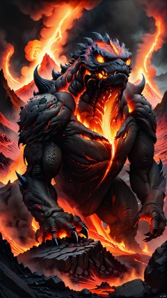 Creature (j/da) Verve (Color Art) (Fantasy Style: 1.5) Hyperrealistic Thick Strokes: 1.5) (Exquisite Details) Lava Monsters are residents of the foothills of a volcano. Their bodies are covered with hardened magma shells, and the rock texture on their bodies Flashing with fiery red light. Their eyes are deep craters, often accompanied by faint smoke