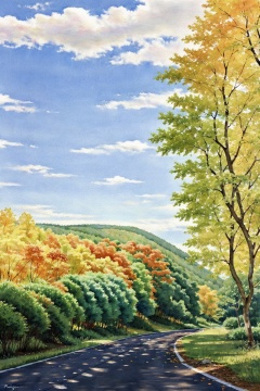 forest,outdoors, painting, day, watercolor,sunny day, road, white clouds, distant view,<lora:mmk_watercolor:1>