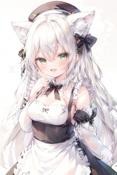 1girl, solo, animal ears, simple background, white background, smile, green eyes, animal ear fluff, long sleeves, :d, white apron, bow, dress, hat, apron, hair ornament, black headwear, black dress, hand up, long hair, very long hair, blush, fang, looking at viewer, bangs, puffy sleeves, frills, black bow, frilled apron, hair bow, waist apron, detached sleeves, hair intakes, beret, hair between eyes, breasts, cat hair ornament, jewelry, black sleeves