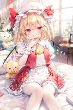 1girl, flandre scarlet, solo, red skirt, red vest, blonde hair, hat, mob cap, red eyes, vest, yellow ascot, wings, skirt, ascot, frills, short sleeves, frilled shirt collar, teddy bear, wrist cuffs, stuffed toy, puffy short sleeves, stuffed animal, looking at viewer, puffy sleeves, white headwear, sitting, crystal, shirt, one side up, finger to mouth, white shirt, pantyhose, bow, white pantyhose, indoors, smile, skirt set, bangs, red ribbon, frilled skirt, flower, on bed, red bow, bed, hat ribbon, long hair, ribbon, petticoat, white flower, blurry, hand up