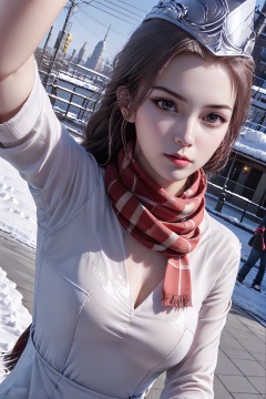 1girl, bibidong,  scarf, red scarf, looking at viewer, brown hair, breasts, outdoors, brown eyes, long hair, crown, arm up, cleavage, solo focus, lips, day, realistic, upper body, forehead, striped, snow, closed mouth, medium breasts