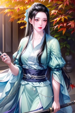Qishuang, solo, long hair, black hair, leaf, weapon, 1girl, autumn leaves, maple leaf, sword, upper body, looking at viewer, holding, brown eyes,nice hands, perfect balance, looking at viewer, closed mouth, (Light_Smile:0.3), official art, extremely detailed CG unity 8k wallpaper, perfect lighting, Colorful, Bright_Front_face_Lighting, White skin, (masterpiece:1), (best_quality:1), ultra high res, 4K, ultra-detailed, photography, 8K, HDR, highres, absurdres:1.2, Kodak portra 400, film grain, blurry background, bokeh:1.2, lens flare, (vibrant_color:1.2), professional photograph,  (narrow_waist), dark studio, , Qishuang