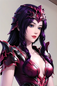 Hongji, 1girl, solo, armor, purple hair, breasts, cleavage, long hair, simple background, white background, upper body, purple eyes, lips, blue eyes, medium breasts, shoulder armor, parted lips,nice hands, perfect balance, looking at viewer, closed mouth, (Light_Smile:0.3), official art, extremely detailed CG unity 8k wallpaper, perfect lighting, Colorful, Bright_Front_face_Lighting, White skin, (masterpiece:1), (best_quality:1), ultra high res, 4K, ultra-detailed, photography, 8K, HDR, highres, absurdres:1.2, Kodak portra 400, film grain, blurry background, bokeh:1.2, lens flare, (vibrant_color:1.2), professional photograph,  (narrow_waist), dark studio, , Mora, Hongji