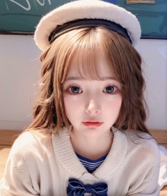 best quality,masterpiece,realistic, jkk, 1girl, solo,  skirt, brown hair, long hair, white skirt, socks,white footwear, indoors, white socks, looking at viewer, school uniform, sailor collar, long sleeves, parted lips, stuffed toy, hat, cosplay, brown eyes,((portrait)),upper_body,close-up