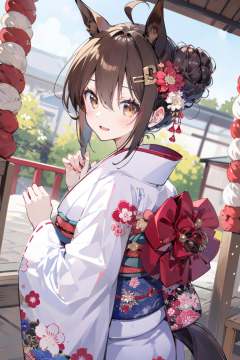 (masterpiece:1.2),best quality,PIXIV,1girl, animal ears, horse ears, tail, japanese clothes, solo, kimono, horse girl, horse tail, brown hair, hair ornament, looking at viewer, looking back, blush, from behind, open mouth, smile, hair flower, bangs, obi, own hands together, floral print, sash, wide sleeves, shrine, brown eyes, flower, white kimono, ahoge, hair between eyes, long sleeves, breath, alternate costume, donation box, hair bun, print kimono, single hair bun, yukata<lora:happy new year_20240102112354-000018:0.8>,