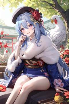(masterpiece:1.2),best quality,PIXIV,1girl,bird,hair ornament,smile,flower,solo,sitting,arrow (projectile),japanese clothes,long hair,looking at viewer,purple eyes,chicken,hair flower,kimono,hamaya,animal,blush,tree,wide sleeves,hairclip,striped,hat,bangs,earrings,closed mouth,red flower,jewelry,holding arrow,long sleeves,x hair ornament,vertical stripes,chinese zodiac,hair between eyes,beret,grey hair,nengajou,branch,sash,skirt,<lora:happy new year_20240102112354-000018:1>,