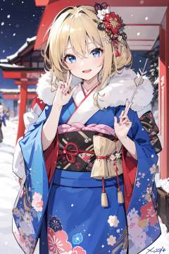 (masterpiece:1.2),best quality,PIXIV,multiple girls,japanese clothes,2girls,hair ornament,kimono,blue eyes,blonde hair,sash,brown hair,obi,smile,arrow (projectile),open mouth,outdoors,:d,holding,hair flower,floral print,looking at viewer,flower,hair between eyes,bangs,print kimono,hamaya,fur collar,wide sleeves,blue kimono,long sleeves,long hair,waving,blush,x hair ornament,new year,bag,holding arrow,ema,snowing,snow,blurry,red flower,kinchaku,holding bag,sidelocks,hand up,signature,fur trim,furisode,standing,day,handbag,depth of field,torii,pouch,<lora:happy new year_20240102112354-000018:0.8>,