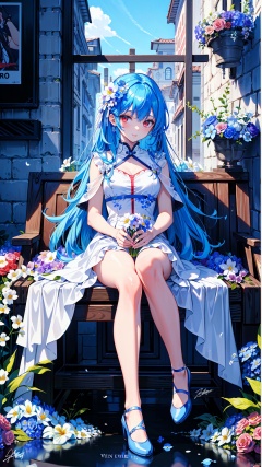 ((best quality)), ((masterpiece)), ((ultra-detailed)), (illustration), (detailed light), (an extremely delicate and beautiful),((trim)),incredibly_absurdres,(ray tracing),(reflection light),((Movie Poster)),(signature:1.3),(English text:1.3),BREAK,(8k:1.3), Wallpaper, 1girl, (girl middle of flower:1.4), (pure skyblue hair, red eyes:1.5), clear sky, outside, ultra-detailed, best quality, extreme quality, Masterpiece, beautiful, pretty, sitting on the ground, (absurdly long hair, clear boundaries of the cloth:1.4), (pure white dress, pure white silk cloth:1.5), (ground of flowers, thousand of flowers, colorful flowers, flowers around her, various flowers:1.51), young, stunning, attractive, sundress, fantastic scenery, pure white shoes,fantasy,cool girl, backlight, colors