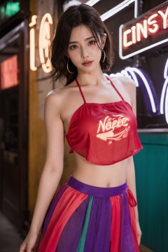 Nights,( parties:1.3), (neon lights:1.4),( lively:1.3), glowing earrings, realistic, pub,1girl, solo, looking at viewer, realistic, midriff, bare shoulders, standting, hair ornament, black hair, jewelry, brown hair, parted lips, skirt, purple skirt, cowboy shot <lora:kim_小红兜_v1:0.75>