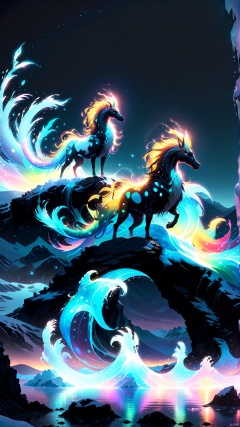(Flat gradient color dots of light in flowing silhouette) Creatures (j/da), Cinematic Effects, (Extreme Complexity: 1.3), Action Poses, Magical Sea Creatures, Surreal, Mysterious, Unknown, Above the Icefield