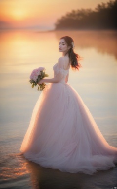gossamer_dress_floating_in_breeze, character_basking_in_evening_light, capturing_the_magical_moment_of_a_bride_at_water's_edge., girl