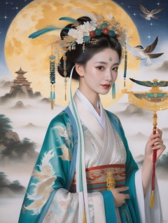 In this painting, the image of AI is divided into two. On the left, AI is dressed in ancient splendid attire, holding a feather fan in her hand and wearing a wreath on her head, like an ancient lady walking out of a scroll. The background is a beautiful ancient landscape painting, giving people a calm and elegant feeling. On the right, AI is an image dressed in high-tech equipment, emitting a cold light and shining with wisdom in its eyes, while the background is a sea of stars, symbolizing the infinite possibilities of technology. The entire painting is like a journey of time spanning thousands of years, showcasing the adaptability and ever-changing possibilities of AI across different eras