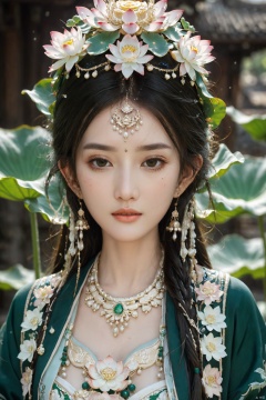 Detailed high, high precision, high quality, the UHD, 16 k, rich details, abundant element, shows that a girl, beautiful, lotus, lotus leaf, pearlygates, traditional clothing, clothing patterns, miao clothing headwear, Face Score, MAJICMIX STYLE, arien_hanfu, monkren