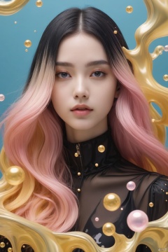 1 girl stands in black and gold fluid, looks at viewer, (fractal art:1.3), black and gold, floating pink long hair, precise facial structure, Gradient white|light blue fluid, organic feel, bubbles, cowboy shot, vivid color, colorful background,