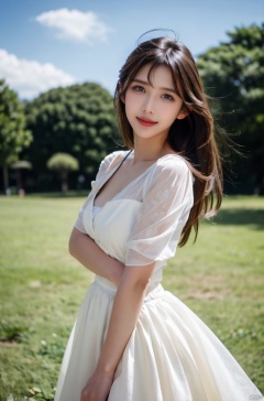 Blue Sky and White Cloud Beach,DSLR, (Good structure), HDR, UHD, 8K, A real person, Highly detailed, best quality, masterpiece, 1girl, realistic, Highly detailed, (EOS R8, 50mm, F1.2, 8K, RAW photo:1.2), ultra realistic 8k, (best illumination, best shadow, extremely delicate and beautiful), (official art, beautiful and aesthetic:1.2), solo, 1girl, , Wind, flowing hair, kind smile, , pose for picture, Dynamic pose, looking_at_viewer,  Detail,