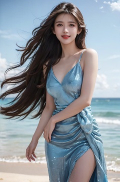 Blue Sky and White Cloud Beach,DSLR, (Good structure), HDR, UHD, 8K, A real person, Highly detailed, best quality, masterpiece, 1girl, realistic, Highly detailed, (EOS R8, 50mm, F1.2, 8K, RAW photo:1.2), ultra realistic 8k, ( solo, 1girl, , Wind, flowing hair, kind smile, , pose for picture, Dynamic pose, looking_at_viewer, Detail,