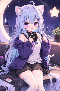 1girl,  cat ears,  blush,  bow,  cat girl,  cat tail,  jacket,  long hair,  looking at viewer,  (multicolored hair:1.2),  off shoulder,  open clothes,  pleated skirt,  purple eyes,  purple hair,  ahoge,  blue hair,  ribbon,  shirt,  skirt,  tail,  (white thighhighs),  (white legwear),  very long hair,  virtual youtuber,  smile,  (star \(symbol\)),  sparkle,  nebula