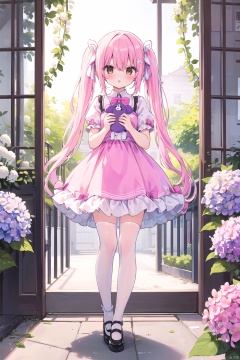 1girl, blush, bow, brown eyes, eyebrows visible through hair, flower, full body, hair between eyes, hair ribbon, holding, holding flower, hydrangea, lily \(flower\), lily of the valley, long hair, looking at viewer, parted lips, pink flower, puffy short sleeves, puffy sleeves, purple bow, purple flower, purple ribbon, ribbon, shoes, skirt, socks, solo, standing, stuffed animal, stuffed toy, twintails, very long hair, white flower, (white legwear)
