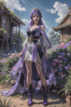 masterpiece,best quality,official art,extremely detailed CG unity 8k wallpaper,realistic,<lora:天穹:0.6>,1girl,dress,solo,jewelry,long hair,hair ornament,earrings,black dress,looking at viewer,flower,light purple hair,light rays,day,desert,air bubble,boots,