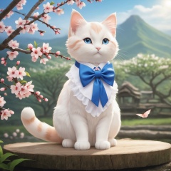 cinematic photo masterpiece,A lovely cat,On the stump.,Peach blossom,Big cat,Lovely,White cat,Blue eyes,Bow knot,Anthropomorphism,Stand,Skirt,,