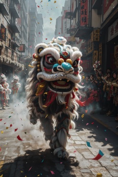 black Chinese lion dance,solo,confetti,colorful,outdoors,no humans,full body,blurry,day,wind,<lora:xingshi-000008:0.6>,festive atmosphere,, masterpiece, best quality,
