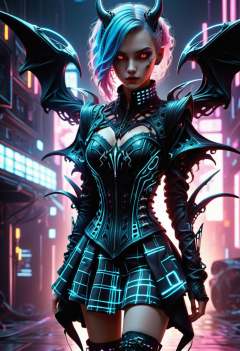 hyper detailed masterpiece, dynamic, awesome quality, DonMN1gh7D3m0nXL constricting full body clothing,  gingham, cyberpunk neon pattern, crystal, batwing sleeves, midi length, empire waist, flared skirt, convertible dress, corset closure,,oil wash,,side pockets,,lace-up back,,pockets, made of night demon  <lora:DonMN1gh7D3m0nXL-v1.1-000008:1>