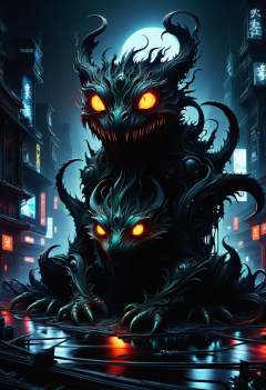 hyper detailed masterpiece, dynamic, awesome quality, DonMN1gh7D3m0nXL  dystopian cityscape changing season,amphibian, made of night demon  <lora:DonMN1gh7D3m0nXL-v1.1-000008:1>